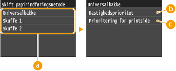 Angiv denne indstilling, når du udskriver et dokument med logo. Hvis du vil udskrive på papir med logo, skal du ændre, hvordan det papir, der er lagt i papirkilden, vender, afhængigt af om du foretager 1- eller 2-sidet udskrivning. Hvis du imidlertid ændrer indstillingen til <Prioritering for printside>, kan du bruge samme papirilægningsmetode (hvilken side, der vender op eller ned) for både 1-sidet og 2-sidet udskrivning (logosiden vender op ved brug af papirskuffen eller ned ved brug af universalbakken). Se under
