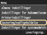 Alle indstillinger om justering og vedligeholdelse vises med korte beskrivelser. Standardindstillingerne er angivet med en daggert (