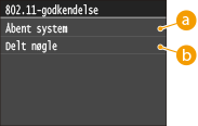 ![]() <Åbent system>Angiver godkendelse af det åbne system, der også kaldes "åben godkendelse".