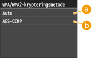![]() <Auto>Angiver maskinen til automatisk at vælge AES-CCMP eller TKIP, så de svarer til den trådløse routers indstilling.