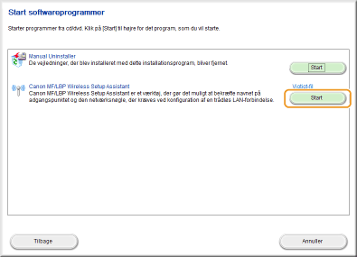 Klik på [Start] for [Canon MF/LBP Wireless Setup Assistant] (Canon MF/LBP-hjælp til trådløs opsætning).