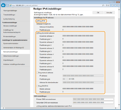 IPv6-adresserne på maskinen kan konfigureres via Brugerinterface til fjernbetjening. Før du indstiller IPv6-adresserne, skal du kontrollere IPv4-adresseindstillingerne (Visning af IPv4-indstillinger). Du skal angive de korrekte IPv4-indstillinger for at bruge IPv6-adresser. Maskinen kan bruge op til ni af følgende IPv6-adresser: