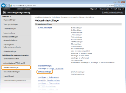 Du kan aktivere eller deaktivere SNMP-indstillingerne fra <Menu> på Hjem-skærmen. SNMP-indstillinger