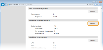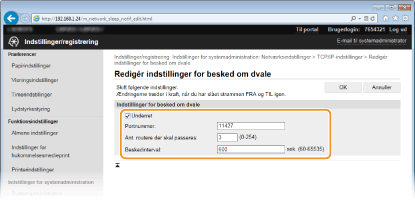 Marker afkrydsningsfeltet for at give software til styring af enheder besked om, om maskinen er tændt eller slukket. Når [Underret] er valgt, kan du forvente, at maskinen undgår unødvendig kommunikation i dvaletilstanden, så det samlede strømforbrug reduceres. [Portnummer]