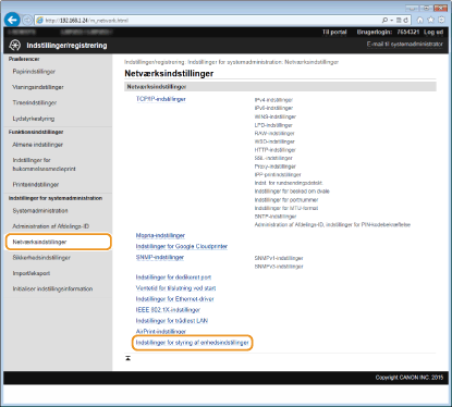 Sådan bruges iW Management Console-plug-insDu skal aktivere dedikeret portindstilling og SNMP-indstilling. For SNMP-indstilling skal du indstille [MIB-adgangstilladelse] til [Læs/skriv] for både SNMPv3 og SNMPv1.-plug-in. Indstillinger for dedikeret port Overvågning og styring af maskinen med SNMP