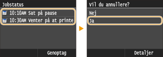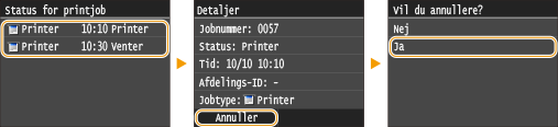 Annullering fra Fjern-UIDu kan annullere udskrivning via siden [Jobstatus] på Fjern-UI: Kontrol af den aktuelle status for dokumenter til udskrivning