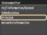 ![]() <Print joblog>Viser en liste over de dokumenter, der er blevet udskrevet. <OK> vises, når et dokument er blevet udskrevet, og <Fejl> udvises, når et dokument ikke kunne udskrives, fordi det blev annulleret, eller der opstod en fejl.