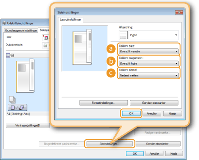 Vælg udskriftsplaceringen af udskriftsdatoen, logonnavnet eller sidetallet