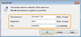 Indtast [Dokumentnavn], [Brugernavn] og [PIN] og tryk på [OK].