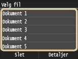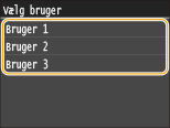 Hvis sikrede dokumenter fra to eller flere brugere holdes i hukommelsen, vises skærmen <Vælg bruger> før skærmen <Vælg fil>. Vælg dit brugernavn.