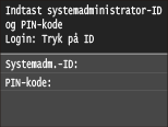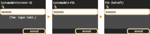![]() Standardindstillingen for systemadministrator-id og pinkode er begge "7654321." Bemærk, at det fra et sikkerhedsmæssigt synspunkt ikke kan anbefales at bruge værdierne, som de er. Det anbefales, at du ændrer værdierne ved at bruge følgende procedure.