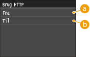 HTTP bruges til kommunikation via netværket, f.eks. når du har adgang til maskinen via Brugerinterface til fjernbetjening. Hvis du bruger en USB-forbindelse eller på anden måde ikke bruge HTTP, kan du deaktivere HTTP, så skadelig indtrængning fra tredjepart via den ubrugte HTTP-port blokeres.
