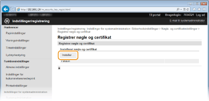 Klik på [Nøgle- og certifikatindstillinger] for at installere et nøglepar eller [CA-certifikatindstillinger] for at installere et CA-certifikat.
