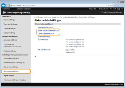[Nøgle- og certifikatindstillinger] eller [CA-certifikatindstillinger].