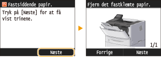 Hvis der er papirstop, vises <Fastsiddende papir.> på skærmen. Tryk på <Næste> for at få vist enkle løsninger*. Hvis du ikke forstår procedurerne på skærmen, skal du se følgende afsnit for at afhjælpe papirstop.