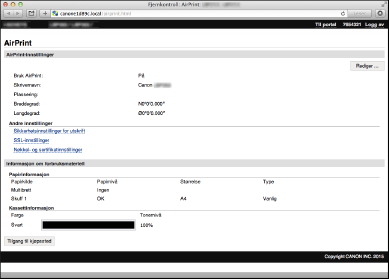 Du kan registrere informasjon, inkludert navnet på maskinen og installasjonsstedet, som brukes for å identifisere maskinen. Du kan også deaktivere AirPrint-funksjonen til maskinen. Bruk Fjernkontroll til å endre disse innstillingene.