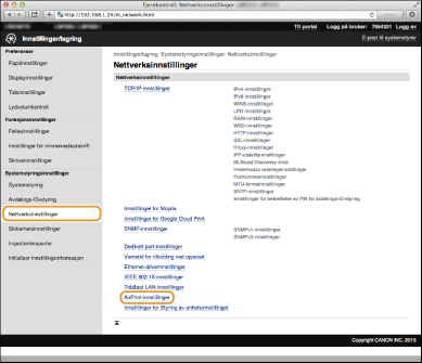 For å endre AirPrint-innstillinger må du logge på i systemstyrermodus.