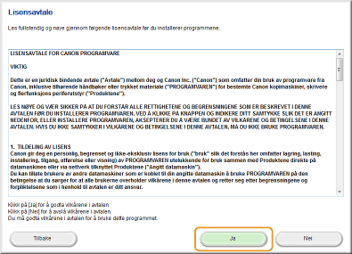 Les lisensavtalen og klikk på [Yes] (Ja) for å godta.
