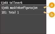 ) vises <Sjekk telleverk>-skjermen. Fra dette skjermbildet kan du vise televerdier for utskrifter i tillegg til serienummeret på maskinen og maskinkonfigurasjonen.