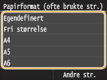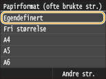 Hvis skjermbildet vist over ikke vises når papir er lagt innHvis du alltid legger i samme papir i flerfunksjonsskuffen, kan du hoppe over innstilling av papir ved å registrere papirformatet og -typen som standardinnstillingen. Når standardinnstillingen er registrert, vises derimot ikke skjermbildet vist over. For å vise skjermbildet, velger du <Angi når papir lastes> (Registrere standard papirinnstillinger for flerfunksjonsskuffen).