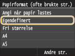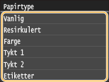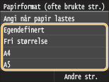 Etter at den standard papirinnstillingen er registrert, vises ikke papirinnstillingsskjermbildet når papir er lagt inn, og den samme innstillingen brukes alltid. Hvis du legger inn et annet papirformat eller -type uten å endre papirinnstillingene, kan det hende at maskinen ikke skriver ut riktig. For å unngå dette problemet velger du <Angi når papir lastes> i trinn 4, og deretter legger du inn papiret.