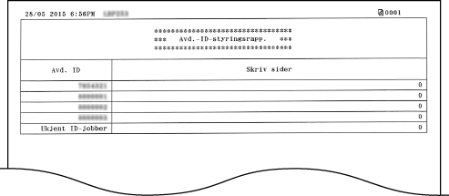 Når avdelings-ID-styring er aktivert, kan du kontrollere det totale antallet utskrifter for hver avdeling <Avdelings-ID> ved å skrive ut en rapport om avdelings-ID-styring. Ved å kontrollere det totale antallet utskrifter blir det enklere å håndtere papir- og tonerrekvisita.