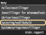 Alle innstillingene om justering og vedlikehold er oppført med korte beskrivelser. Standardinnstillinger er merket med en dolk (