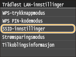 Hvis den trådløse tilkoblingen konfigureres ved å velge en trådløs ruter, er WEP-godkjenningsmetoden angitt til <Åpent system> eller WPA/WPA2-krypteringsmetoden er angitt til <Auto> (AES-CCMP eller TKIP). Hvis du vil velge <Delt nøkkel> for WEP-godkjenning eller <AES-CCMP> for WPA/WPA2-kryptering, må du konfigurere tilkoblingen ved hjelp av den manuelle inntastingsmetoden ( Konfigurere tilkobling ved å angi detaljerte innstillinger).