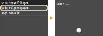 Du kan søke etter trådløse rutere (eller tilgangspunkt) som er tilgjengelige for tilkobling, og velge en fra skjermen på maskinen. Tast inn en WEP-nøkkel eller PSK for nettverksnøkkelen. Før du velger en trådløs ruter, må du kontrollere og skrive ned den nødvendige konfigurasjonsinformasjonen, inkludert SSID-en og nettverksnøkkelen (