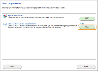 Klikk på [Start] (Start) for [Canon MF/LBP Wireless Setup Assistant] (Trådløs oppsettassistent for Canon MF/LBP).