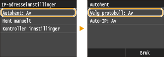 ![]() Hvis <På> vises, trykker du på <Autohent> og angir både <Velg protokoll> og <Auto-IP> til <Av>.