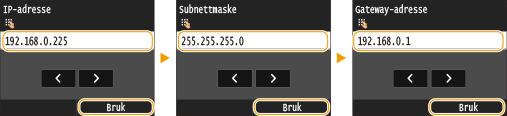 <Subnettmaske> <Gateway-adresse>.Angi hver innstilling med talltastene, og trykk på <Bruk>.