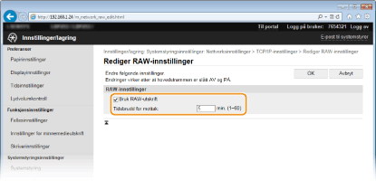 Merk av i boksen for å skrive ut via RAW. Når du ikke bruker RAW-utskrift, fjerner du merket i boksen. [Tidsbrudd for mottak]