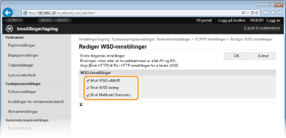 Merk av i boksen for å hente informasjon om maskinen fra en datamaskin via WSD. Det er merket av i boksen automatisk når det også er merket av for [Bruk WSD-utskrift]. [Bruk Multicast Discovery]