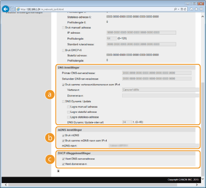 Merk av i boksen for en dynamisk oppdatering av DNS-postene når maskinens IP-adresse endres. Hvis du vil angi typen(e) adresser du vil registrere på DNS-serverer, merker du av for [Lagre manuell adresse], [Lagre stateful-adresse] eller [Lagre stateless-adresse]. Hvis du vil angi intervallet mellom oppdateringer, angir du tiden i timer i tekstboksen [DNS Dynamic Update-intervall]. [mDNS-innstillinger][Bruk mDNS]