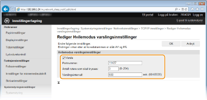Merk av i boksen for å varsle enhetsbehandlingsprogramvaren om strømstatusen for maskinen. Når [Varsle] er valgt, kan du forvente at maskinen unngår unødvendig kommunikasjon under dvalemodus og reduserer det totale strømforbruket. [Portnummer]
