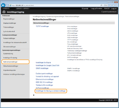 Bruk av iW Management Console-pluginsDu må aktivere dediserte portinnstillinger og SNMP-innstillinger. For SNMP-innstillinger skal du sette [MIB-tilgangstillatelse] på [Lese/skrive] for både SNMPv3 og SNMPv1. plug-in. Dedikert port-innstillinger Overvåke og kontrollere maskinen med SNMP