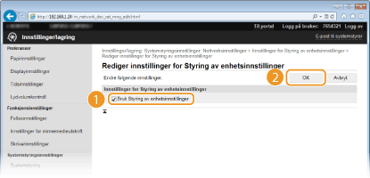 Bruke betjeningspaneletDu kan også konfigurere innstillinger for styring av enhetsinnstillinger fra <Meny> på Hjem-skjermbildet. Styring av enhetsinnstillinger på/av