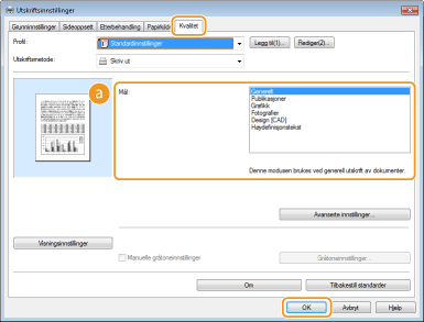 Velg et alternativ som passer dokumenttypen eller formålet med utskriften. Velg for eksempel [Generelt] for generelt bruk, eller velg [Fotografier] når du vil skrive ut fotografier i optimal utskriftskvalitet.