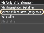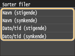 Når du velger <Dato/tid (stigende)> eller <Dato/tid (synkende)>, sorteres filer basert på endringsdatoene og tiden til filene.