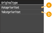 Du kan velge type original avhengig av bildet som skal skrives ut. Velg <Fotoprioritet> eller <Tekstprioritet>.