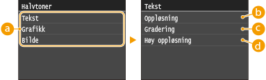 Du kan velge utskriftsmetode for å gjengi halvtoner (området mellom de lysere og mørkere områdene i et bilde) for optimal bildekvalitet. Trykk på <Gradering> eller <Feilspredning>.