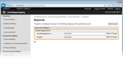 Tast inn et krypteringspassord for opptil 32 alfanumeriske tegn. Tast inn samme passord i [Bekreft]. Du må angi et krypteringspassord for å eksportere dataene.
