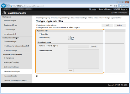Hvis MAC-adresser blir angitt feil, kan det hende at du ikke får tilgang til maskinen fra Fjernkontroll. I så fall må du angi <MAC-adressefilter> til <Av>. MAC-adressefilter
