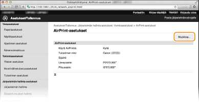 Voit tallentaa tiedot, joita käytetään laitteen tunnistamiseen, mm. laitteen nimen ja asennuspaikan. Voit myös poistaa laitteen AirPrint-toiminnon käytöstä. Käytä etäkäyttöliittymää näiden asetusten muuttamiseen.