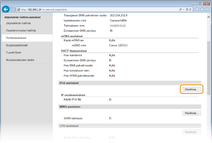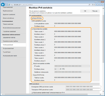 Laitteen IPv6-osoitteet voidaan määrittää etäkäyttöliittymän avulla. Tarkista IPv4-osoiteasetukset ennen IPv6-osoitteiden asettamista (IPv4-asetusten näyttäminen). Sinun on asetettava oikeat IPv4-asetukset, jotta voit käyttää IPv6-osoitteita. Laite voi käyttää enintään yhdeksää seuraavista IPv6-osoitteista: