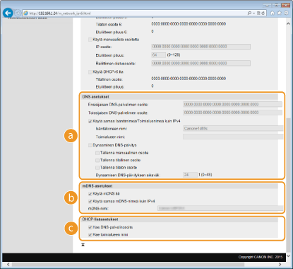 Valitse tämä valintaruutu, kun haluat, että DNS-tiedot päivitetään dynaamisesti aina, kun laitteen IP-osoite muuttuu. Määritä osoitetyyppi/-tyypit, jotka haluat tallentaa DNS-palvelimelle, valitsemalla valintaruutu [Tallenna manuaalinen osoite], [Tallenna tilallinen osoite] tai [Tallenna tilaton osoite]. Määrittääksesi päivitysten välisen ajan, syötä aika tunteina [Dynaamisen DNS-päivityksen aikaväli] -kenttään. [mDNS-asetukset][Käytä mDNS:ää]