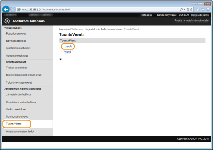 Lataa (tuo) tiedot, jotka vietiin koneesta. Voit myös tuoda asetukset toisesta laitteesta, jos se on sama malli kuin sinun koneesi.