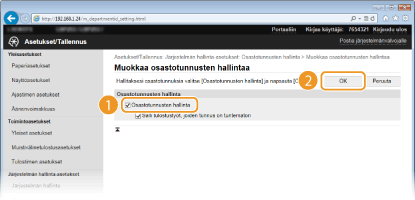 Valitse [Käytä osastotunnusten hallintaa] -valintaruutu ja napsauta [Asetukset] sen oikealla puolella.