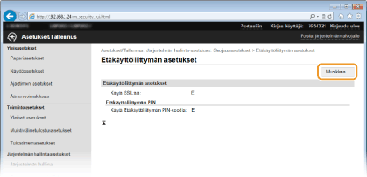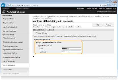 ![]() Käyttöpaneelin käyttäminenVoit asettaa etäkäyttöliittymän pääsyn PIN-koodin myös Koti-näytön kohdasta <Valikko>. Etäkäyttöliittymän asetukset